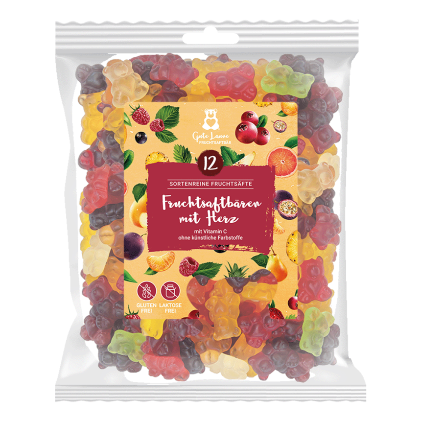 Zutaten: Glukosesirup, Zucker, 20 % Fruchtsaft aus Fruchtsaftkonzentraten (Himbeere, Erdbeere, Waldfrucht, Brombeere, Pfirsich, Preiselbeere, Birne, Grapefruit, schwarze Johannisbeere, Mandarine, Ananas, Maracuja), Gelatine, Säuerungsmittel (Citronensäure), Acerola-Fruchtpulver, Ascorbinsäure (Vitamin C), Aromen, färbende Lebensmittel (Konzentrate aus Karotte, Kürbis, Saflor, Apfel, Spirulina, schwarzer Karotte und Holundersaft), Überzugsmittel (Carnaubawachs)