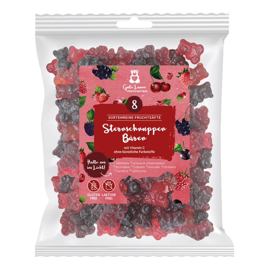 Zutaten: Glukosesirup, Zucker, 20% Fruchtsaftanteil aus 3% Fruchtsaftkonzentraten (Waldbeere, schwarze Johannisbeere, Brombeere, Erdbeere, Holunder, Himbeere, Cranberry, Süßkirsche), Gelatine, Säuerungsmittel: Zitronensäure, Acerola Fruchtpulver, Aromen, färbende Lebensmittel (Konzentrate aus schwarzer Karotte und Holundersaft), Überzugsmittel: Carnaubawachs.