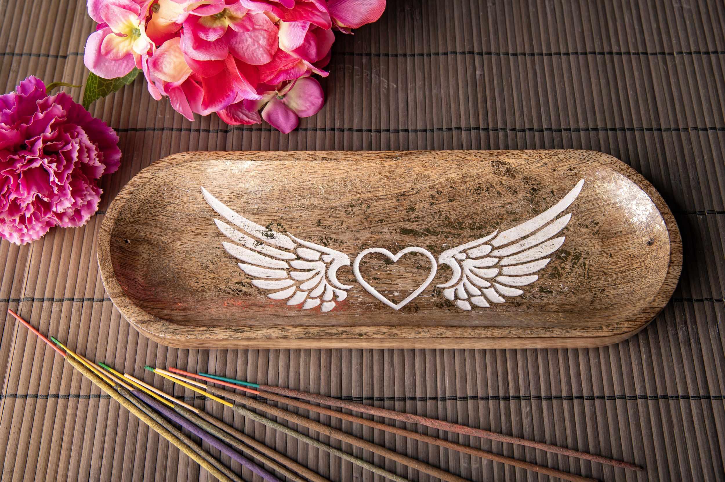 Der liebevoll mit Lasergravur verzierte Räucherstäbchenhalter aus Mangoholz mit einem filigranen gewachsten Engelsflügelmotiv und einem wunderschönen Goldschimmer-Effekt setzt Ihre Räucherstäbchen perfekt in Szene. Durch seine Größe und die Schalenform fängt er zuverlässig die herabfallende Asche auf. Eine Kombination aus symbolträchtiger Dekoration und praktischem Gebrauchsgegenstand!