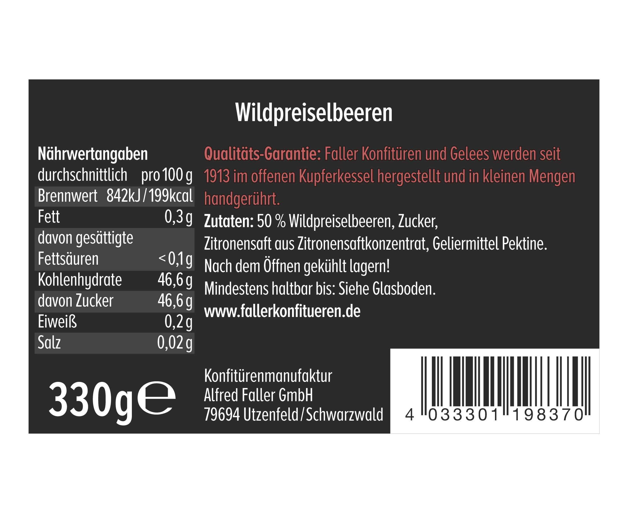 Zutaten: Wildpreiselbeeren, Zucker, Zitronensaft aus Konzentrat, Geliermittel Apfelpektine. Nach dem Öffnen bitte gekühlt lagern!