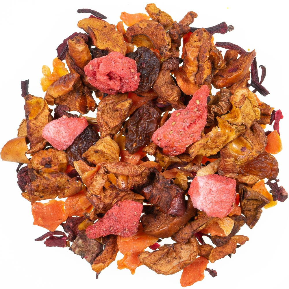 Zutaten: Apfelstücke (Apfel*, Säuerungsmittel, Zitronensäure), Weinbeeren*, Karottenstücke*, Rote Beetestücke*, Hibiskusblüten*, natürliches Frucht-Sahne-Aroma (enthält Milch), Erdbeerstücke* (1%), Vanillestücke* (0,5%). * aus kontrolliert biologischem Anbau.