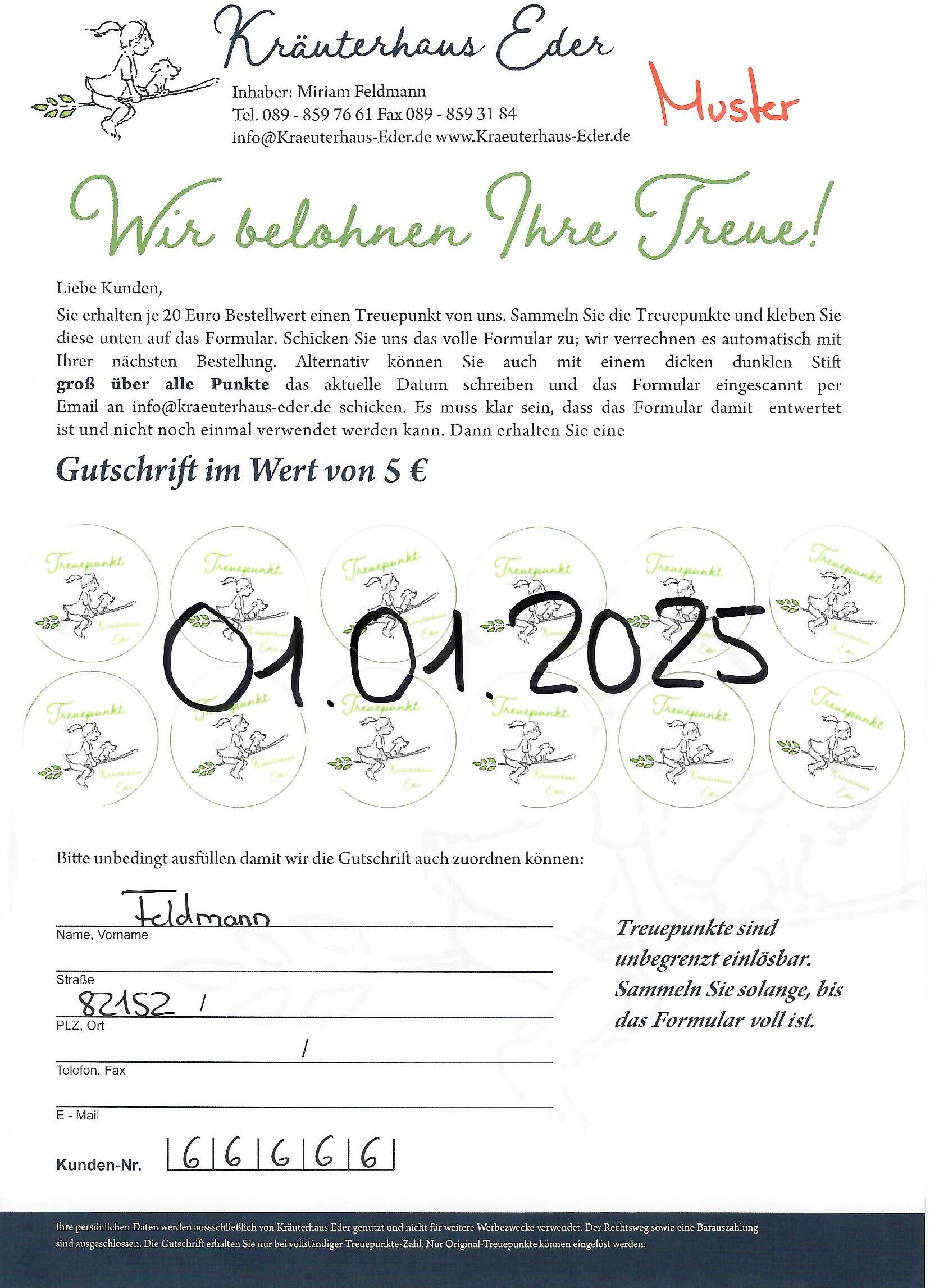 Sammeln Sie die Treuepunkte und kleben Sie diese auf das Formular. Schicken Sie das volle Formular mit Ihrer Bestellung an uns zurück und wir verrechnen Ihnen mit Ihrer nächsten Bestellung eine Gutschrift im Wert von 5 Euro.